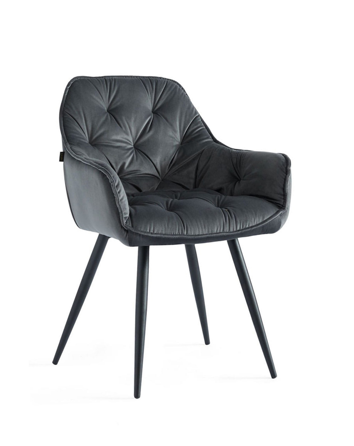 Krzesło jadalniane SKOT posiada ramę metalową, lakierowaną proszkowo na kolor czarny. Siedzisko tapicerowane aksamitną tkaniną w kolorze szarym. Stopki nierysujące podłogi.