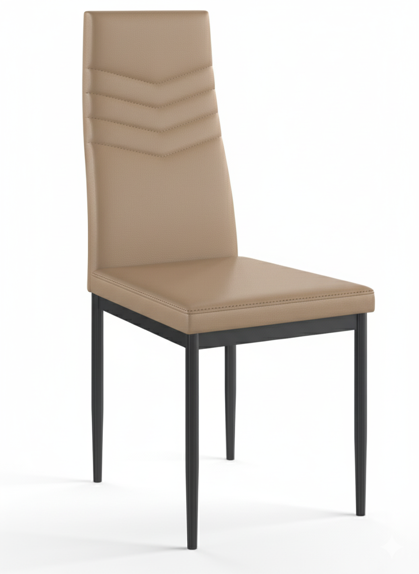 Krzesło jadalniane KIRA posiada ramę metalową, lakierowaną proszkowo na kolor czarny. Siedzisko tapicerowane imitacją skóry w kolorze beżowym. Stopki nierysujące podłogi.